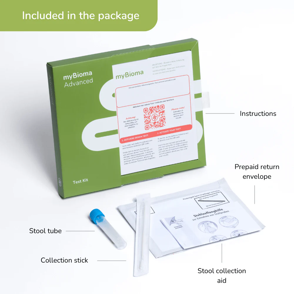 Mit dem myBioma Advanced Test erhältst du alle Informationen des Basic Tests und erfährst zusätzlich, wie deine Darmbakterien mit dem Immunsystem, Entzündungen, der Hautgesundheit und deinem Gewicht in Verbindung stehen. Zudem bekommst du Hinweise darauf, ob deine Bakterienzusammensetzung auf Beschwerden wie Leaky Gut, SIBO, Glutensensitivität oder Reizdarm hindeutet.